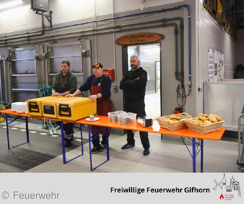 Im Anschluss wurden im Feuerwehrhaus Gifhorn die Fahrzeuge wieder einsatzbereit hergerichtet. Durch unsere Verpflegungseinheit wurde eine warme Mahlzeit serviert.