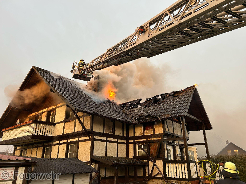 Zur Brandbekämpfung wurden mehrere Trupps unter Atemschutz über die Drehleiter eingesetzt. Teile der Dachdeckung wurden entfernt, um alle Glutnester zu erreichen.