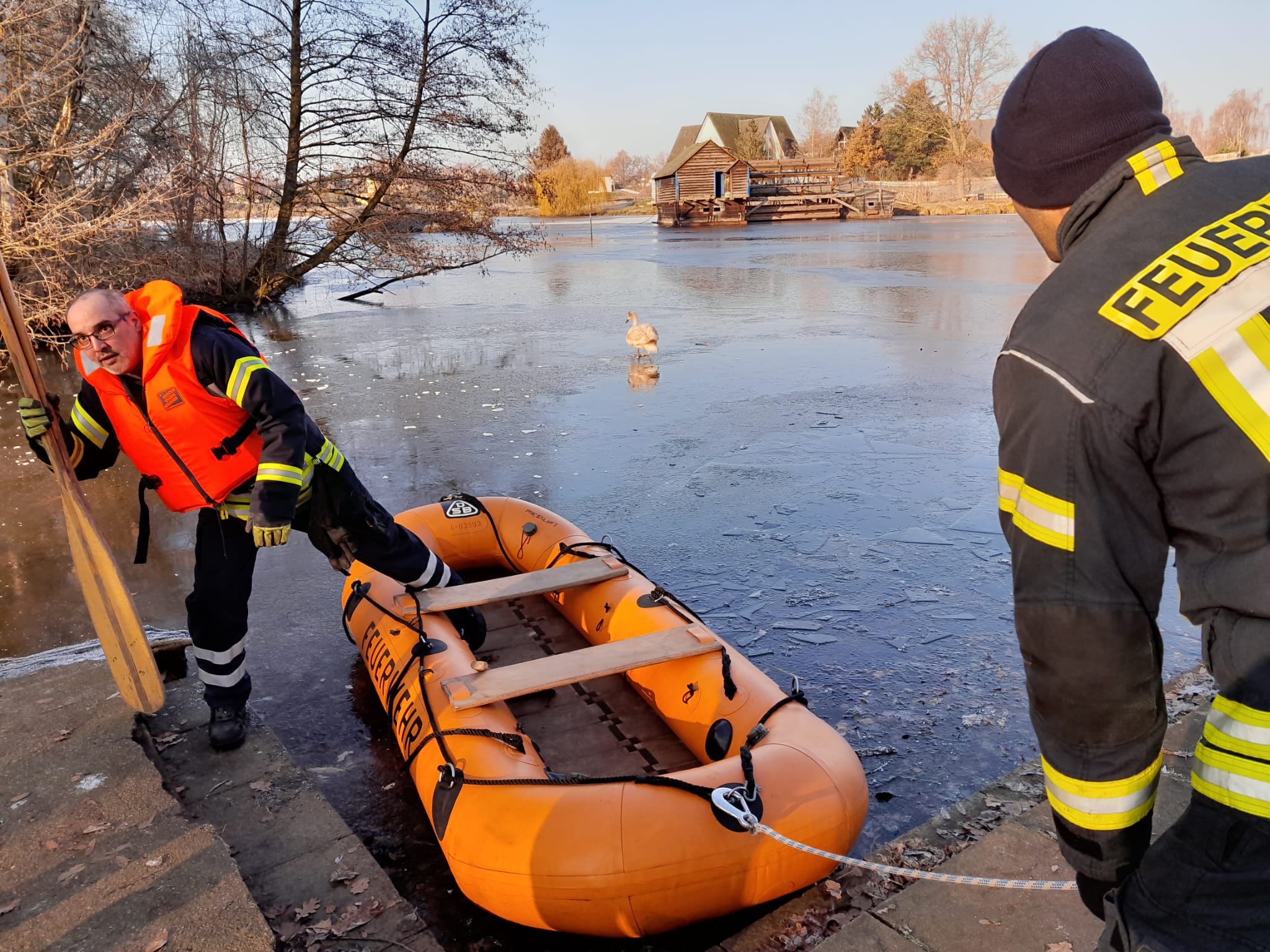 Nach dem das Schlauchboot zu Wasser gelassen wurde und sich dem Schwan näherte, stellte sich heraus, dass dieser nicht festgefroren war.