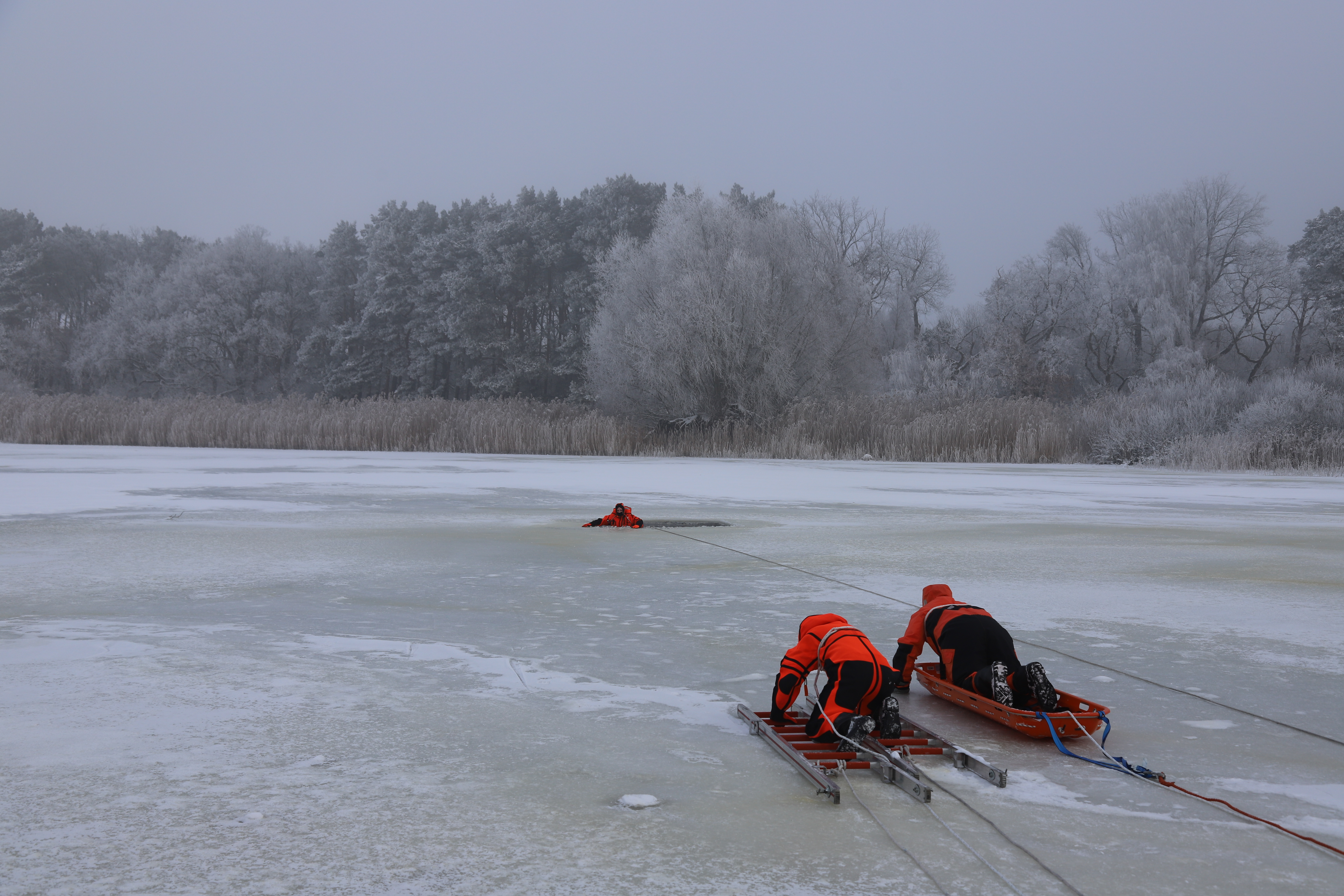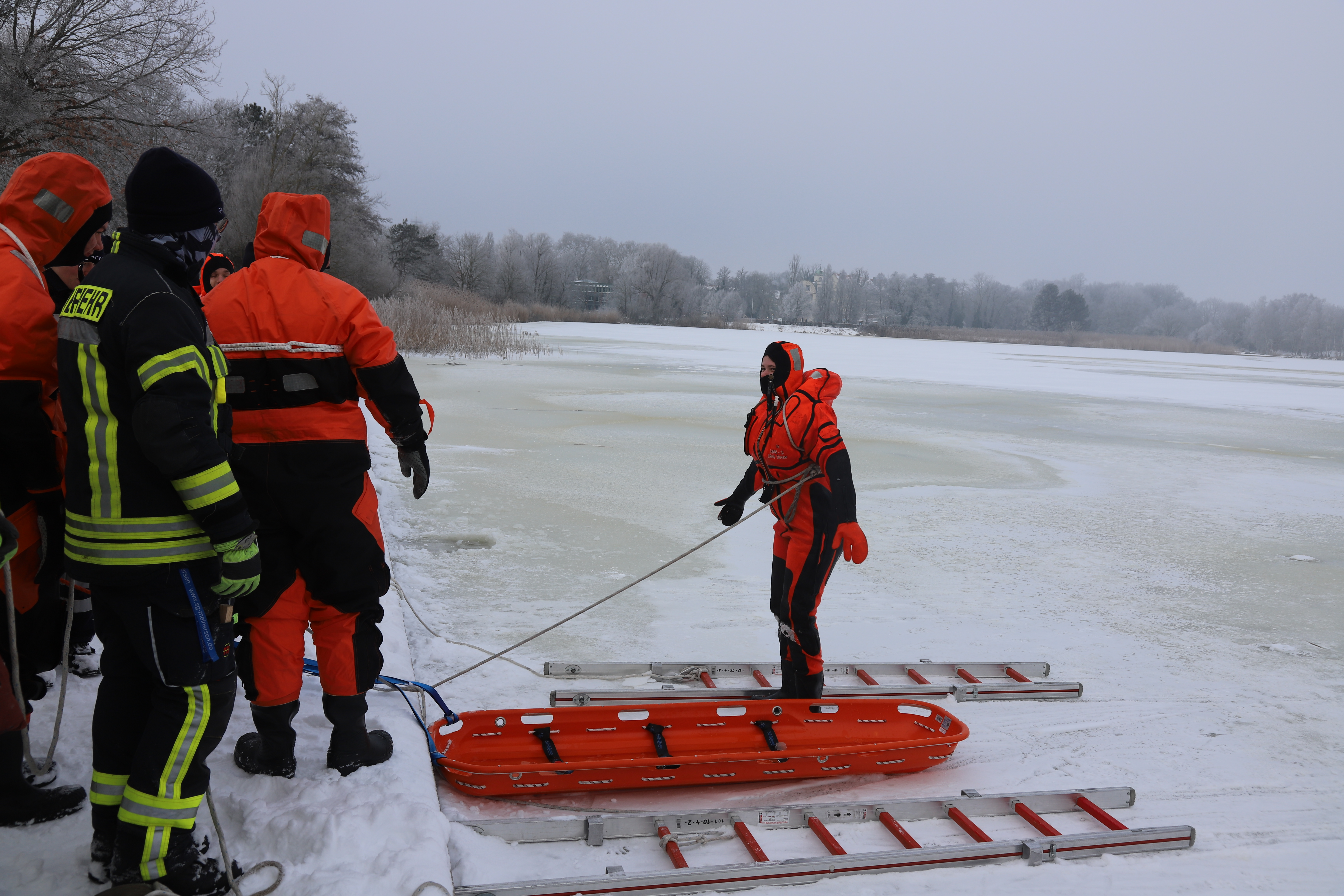 Die Sicherheit der Einsatzkräfte stand während der gesamten Ausbildung an erster Stelle. Alle Personen, die die Eisfläche betraten, waren entsprechend gesichert und trugen spezielle Überlebensanzüge, um sich vor der Kälte und einer möglichen Unterkühlung zu schützen.
