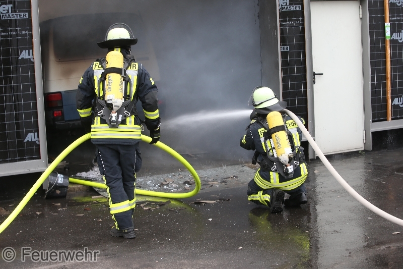 Ein Trupp unter schwerem Atemschutz begann sofort mit der Brandbekämpfung, ein weiterer Trupp kontrollierte unter Atemschutz die Nachbarbereiche der Werkstatt ab.