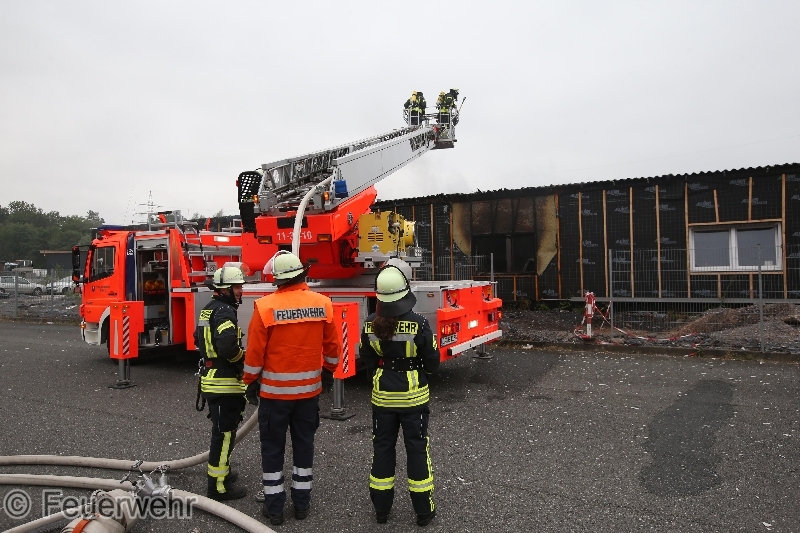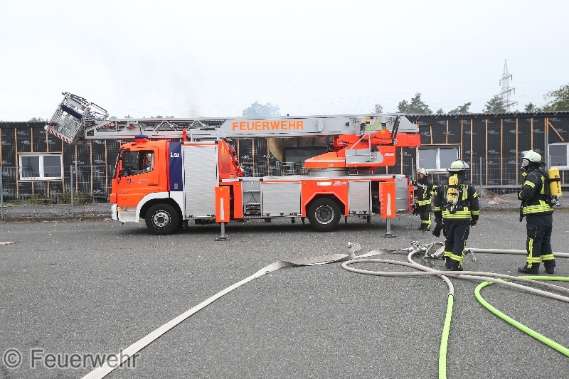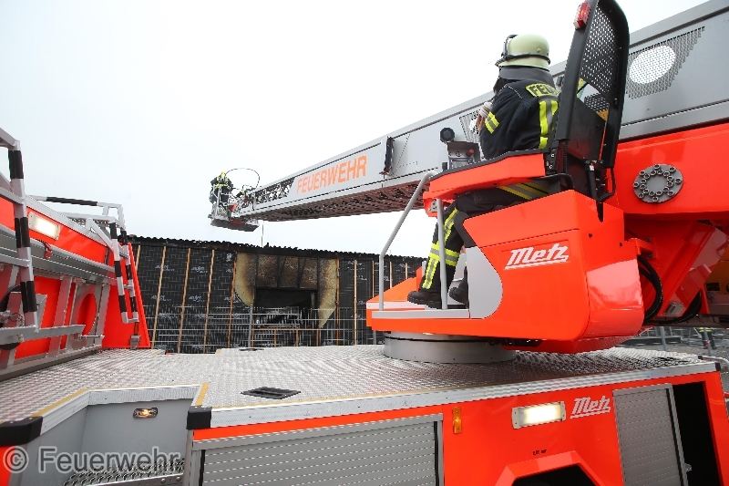 Die Drehleiter wurde in Stellung gebracht, um das Dach zu öffnen und Brandnester abzulöschen.