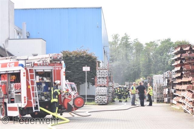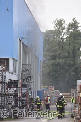 Ein Trupp unter schwerem Atemschutz gingen mit einem C-Rohr zur Erkundung und zur Brandbekämpfung in die Produktionshalle vor.