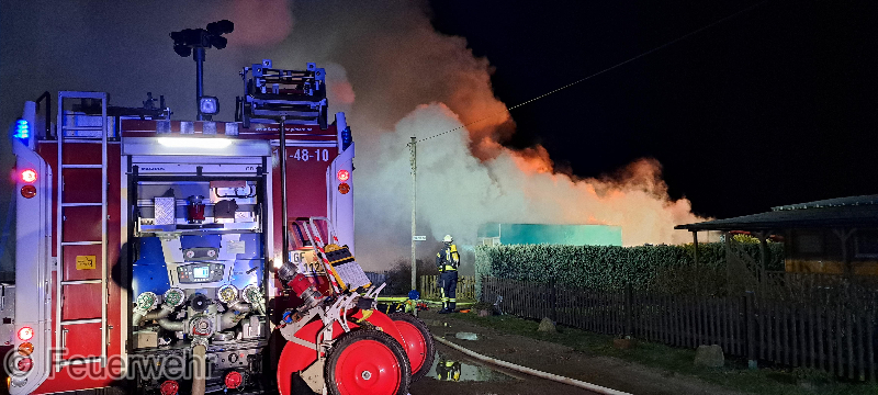 Beim Eintreffen der ersten Einsatzkräte an der Einsatzstelle war eine Rauchentwicklung aus dem Dach eines Holzbungalow wahrnehmbar. Innerhalb von kurzer Zeit fand eine Durchzündung statt, wodurch das Gebäude im Anschluss in Vollbrand stand.