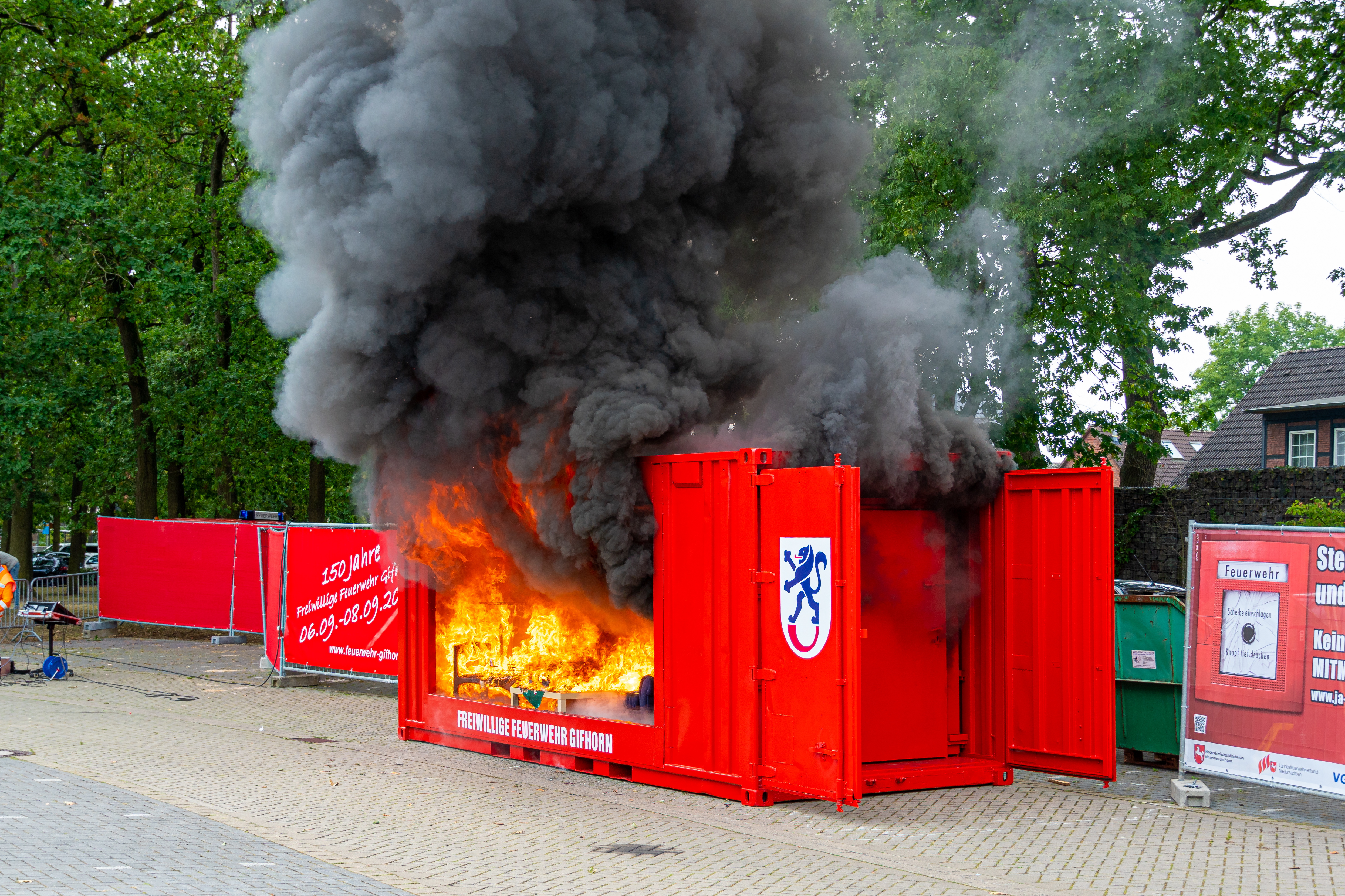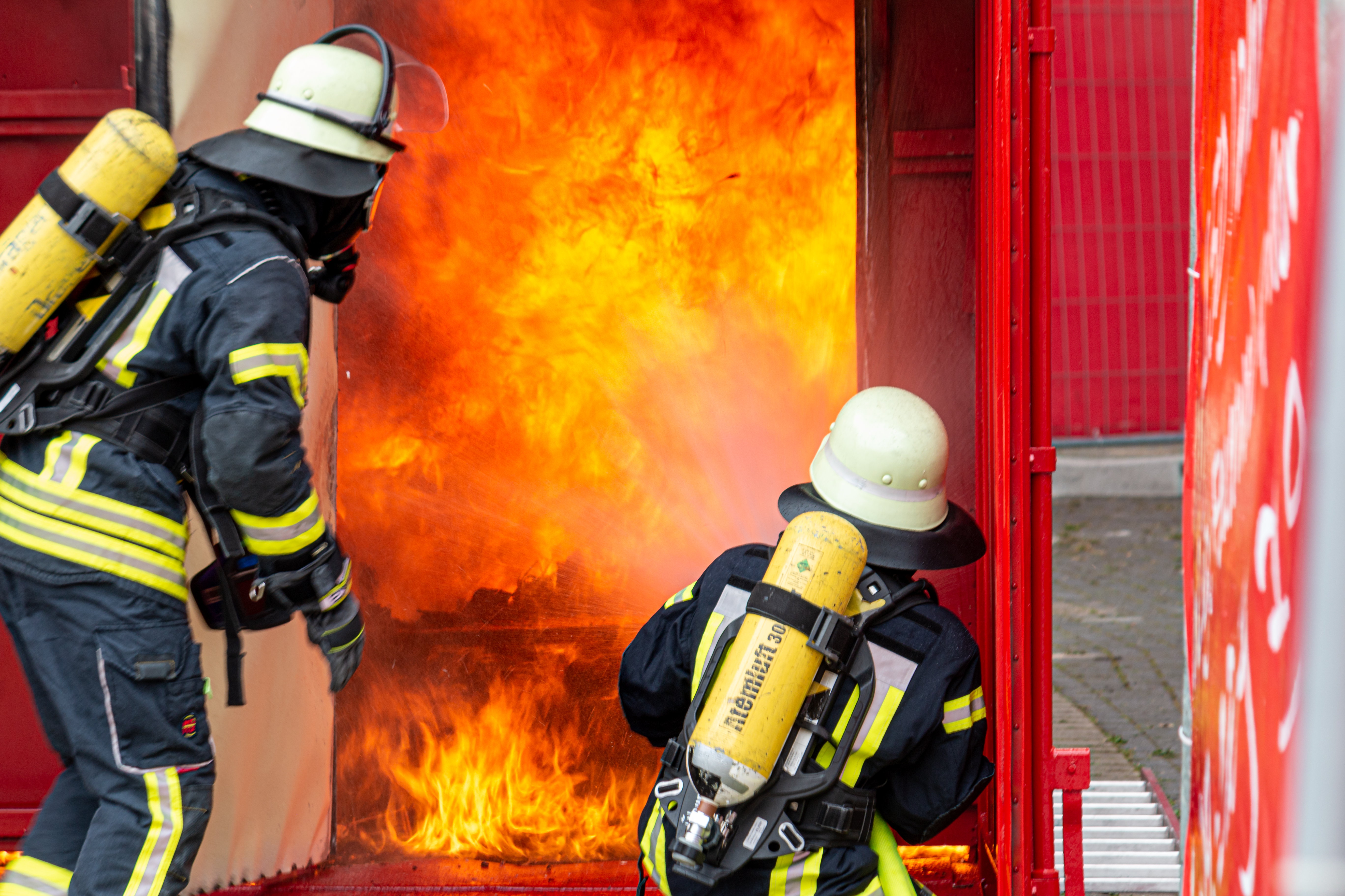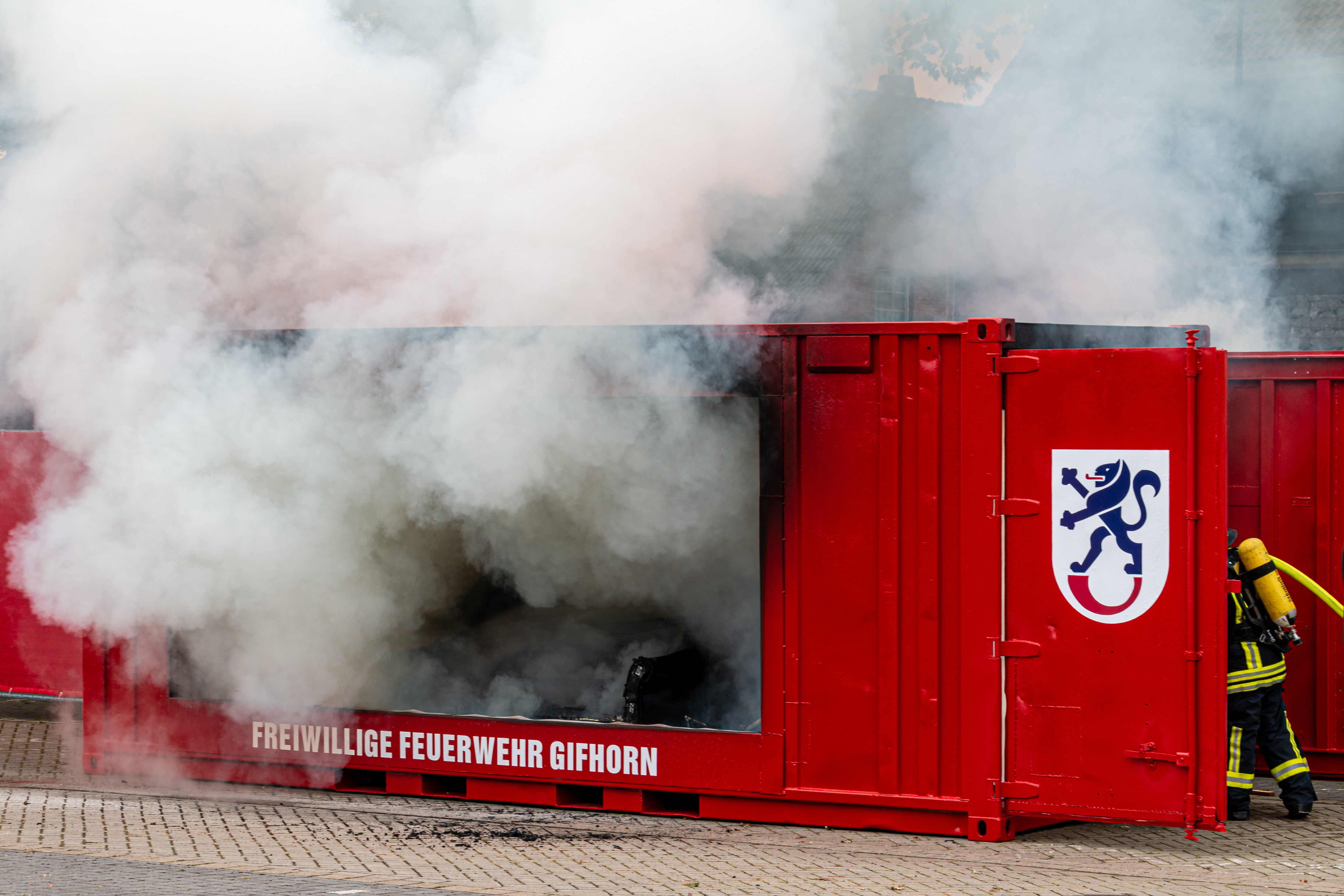 In einem umgebauten Schiffskontainer wurde ein Zimmerbrand simuliert. Hierbei konnte die schnelle Brandausbreitung realistisch verfolgt werden.