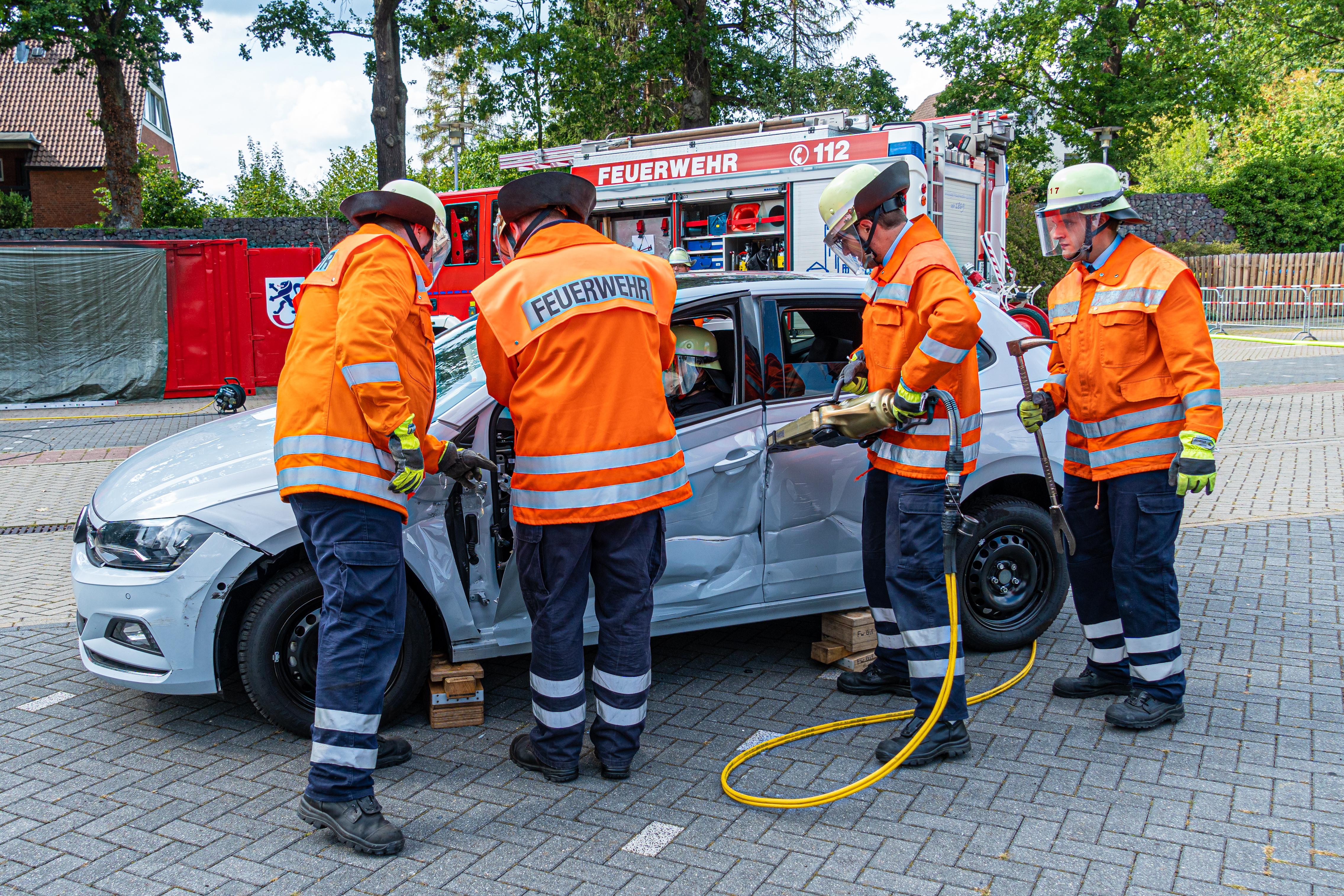 Bei der Vorführung der technischen Hilfeleistung wurde das Retten aus einem verunfallten Fahrzeug vorgeführt. Hier wurde paralell an zwei Fahrzeugen gearbeitet. Einmal wie es früher gemacht wurde und zum Vergleich die Rettung von heute, um den Fortschritt der Technik zu demonstrieren.
