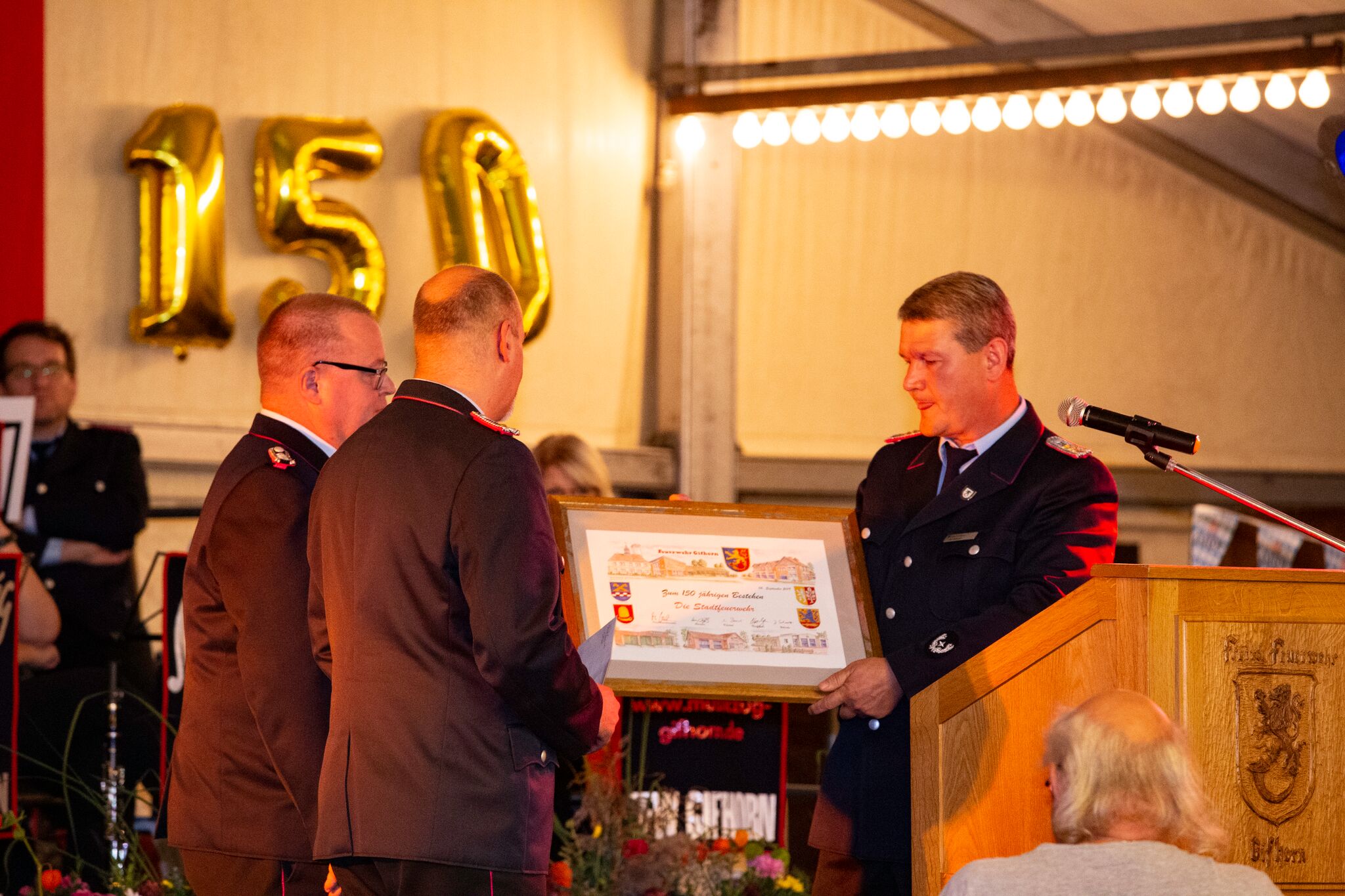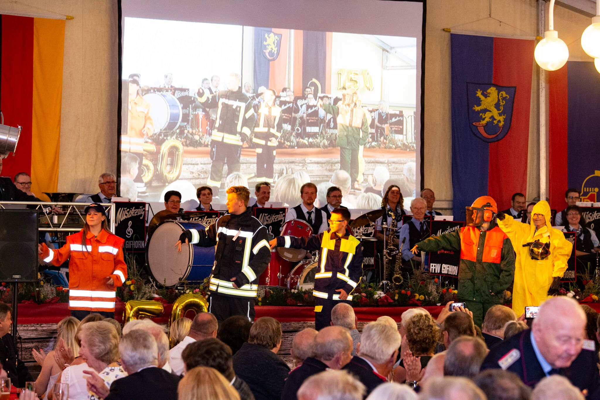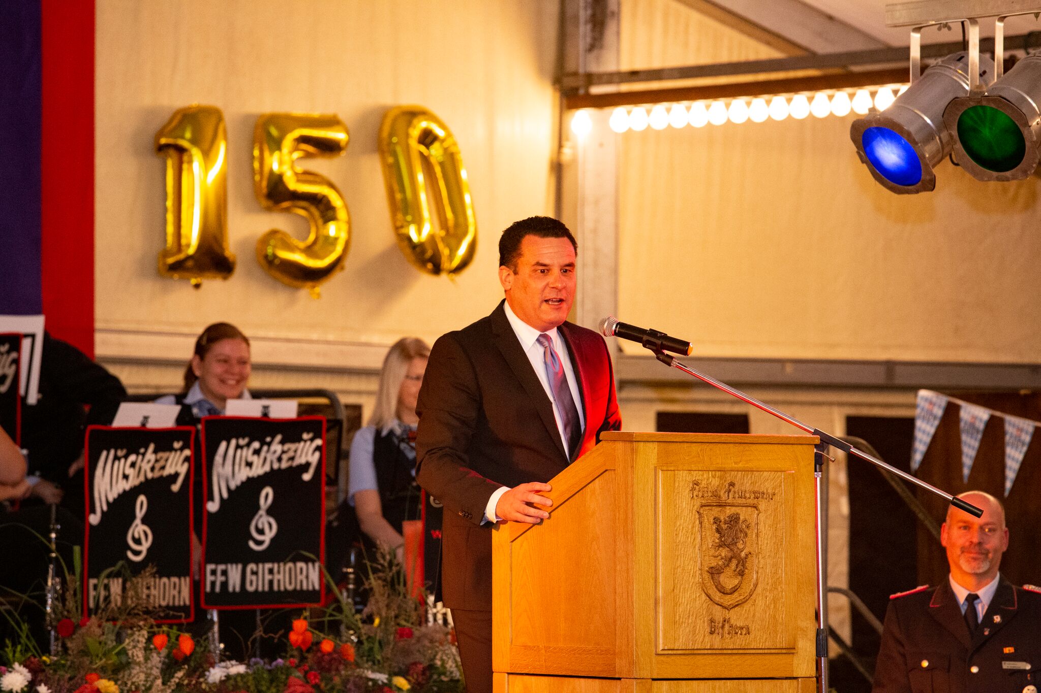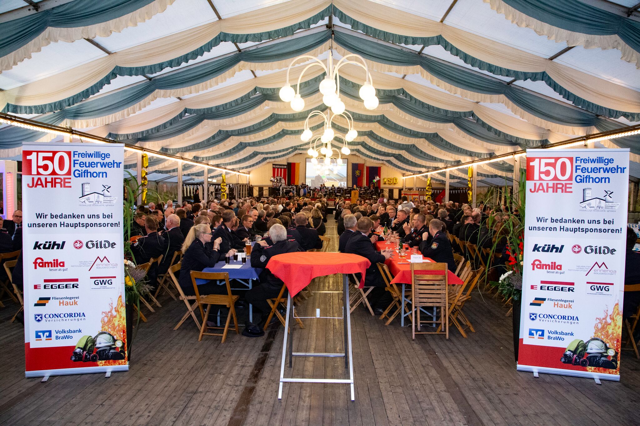 Den Auftakt zum Jubiläumswochenende machte am Freitagabend ein großer Festkommers anlässlich unseres 150 jährigen Bestehens. Viele geladene Gäste von Feuerwehr, Förderer, Rat und Verwaltung unserer Feuerwehr sorgten für ein gut gefülltes Festzelt auf dem Gifhorner Schützenplatz. Auch unsere befreundeten Kameradinnen und Kameraden von den Feuerwehren Bischofsgrün und Dumfries (Schottland) konnten wir begrüßen. Viele Grußworte und die Chronik unserer Wehr haben eindrucksvoll untermauert wie wertvoll unsere Arbeit war, ist und auch immer sein wird.