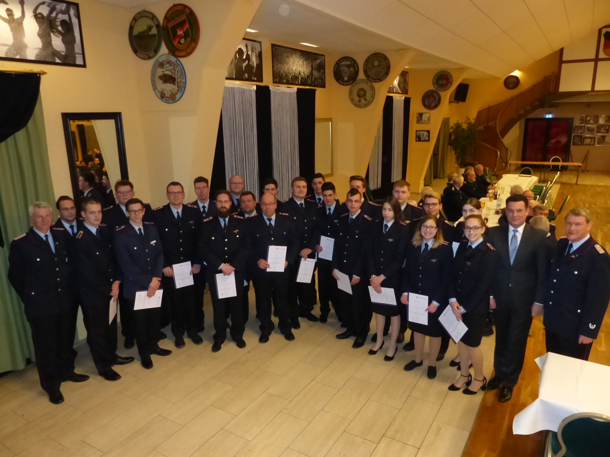 Im vergangenen Jahr konnten 11 Mitglieder aus der Jugendfeuerwehr übernommen werden. Alle absolvierten im Herbst erfolgreich die Truppmann Ausbildung Teil 1, ein weiterer Kamerad hatte die Truppmann Ausbildung Teil 1 bereits im Vorjahr absolviert. Alle 11 Kameraden haben sich an diesem Abend zum Dienst in der aktiven Feuerwehr verpflichtet und wurden somit zur Feuerwehrfrau beziehungsweise zum Feuerwehrmann befördert.