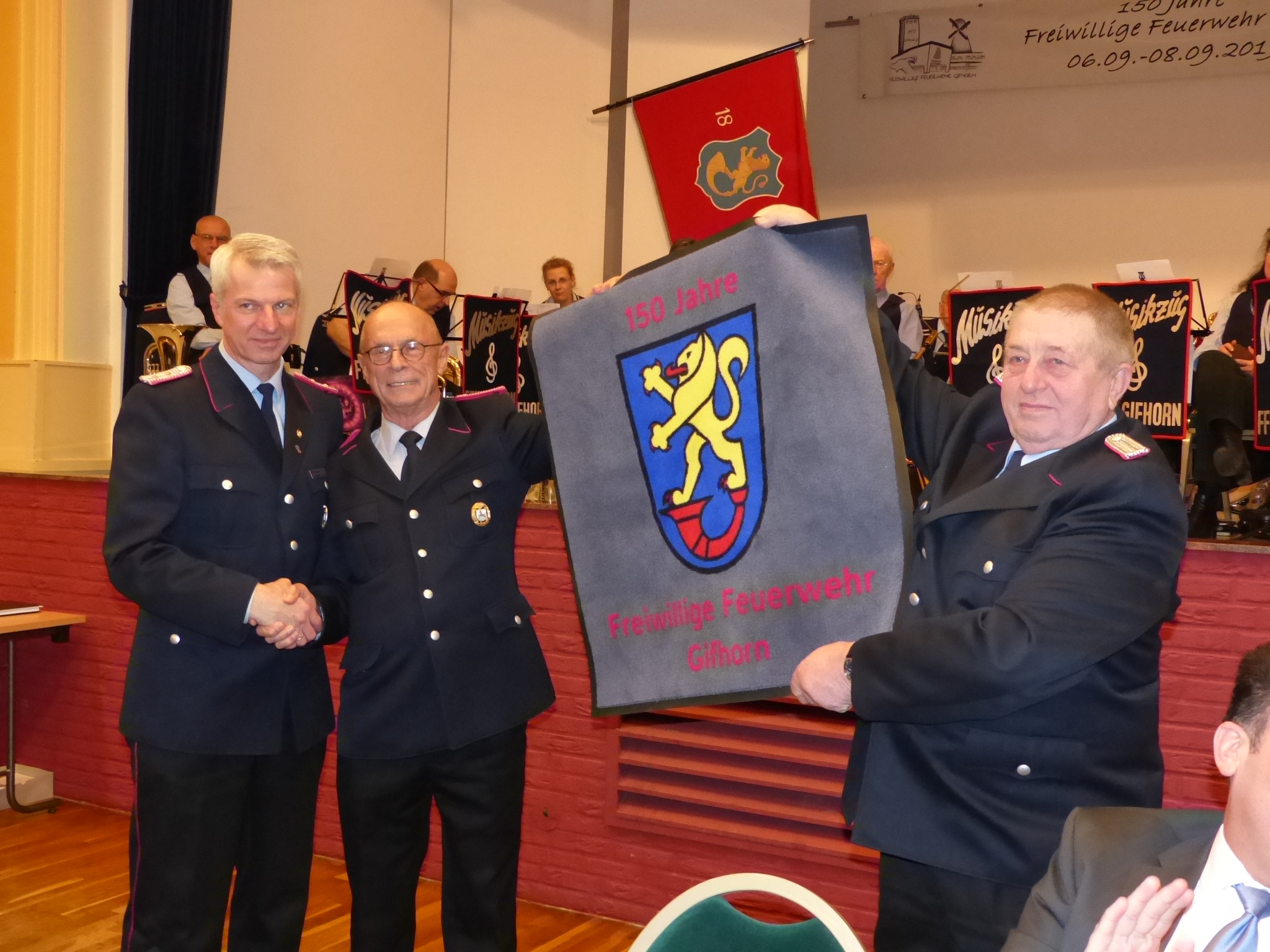 Wolfgang Scharfenberg berichtete aus der Seniorenabteilung in der unverändert 30 Kameraden ihren Dienst verrichten, wobei 10 aus Gesundheitlichen Gründen unter 67 sind. Unsere Altersabteilung beschäftigt sich hauptsächlich mit den 1360 Hydranten in Gifhorn und Winkel. Außerdem wurde von der Fahrt nach Bremerhaven im Mai berichtet. Zum 150-Jährigen Jubiläum haben sie etwas besonders anfertigen lassen und überreichten Uwe Michel einen extra angefertigten Teppich.
